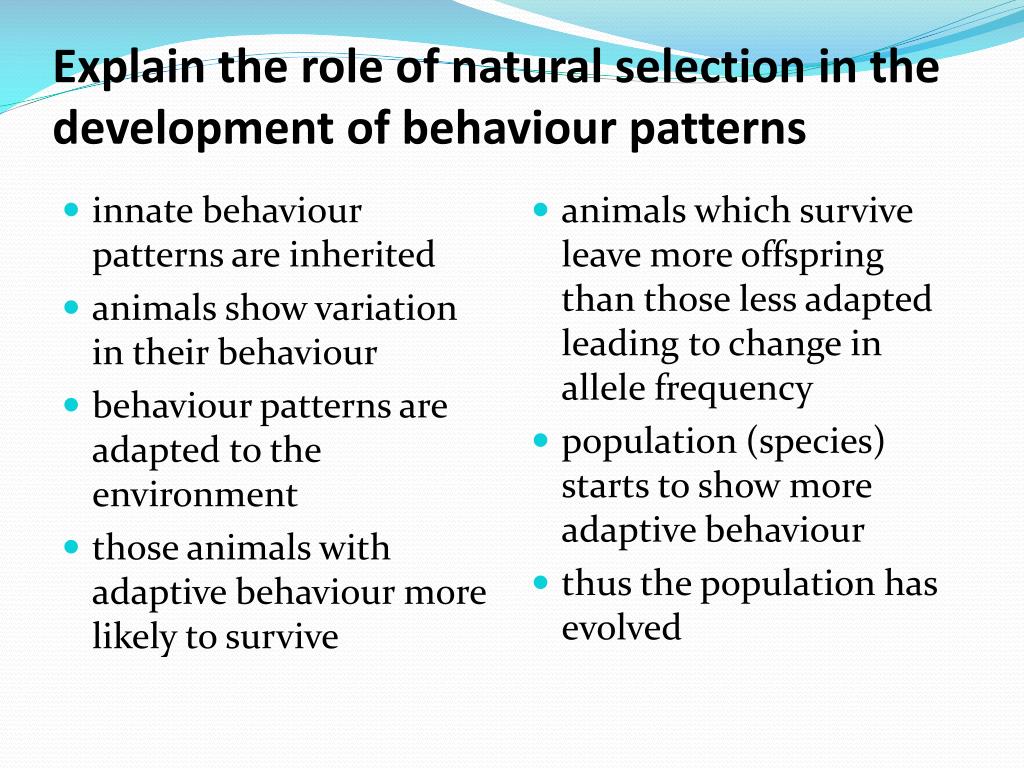 Explain the role of natural selection in the development of behaviour patterns • innate behaviour patterns are inherited • animals show variation in their behaviour • behaviour patterns are adapted to the environment • those animals with adaptive behaviour more likely to survive • animals which survive leave more offspring than those less adapted leading to change in allele frequency • population (species) starts to show more adaptive behaviour • thus the population has evolved