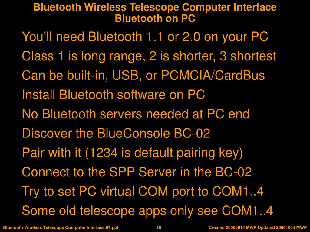 Bluetooth on PC You’ll need Bluetooth 1.1 or 2.0 on your PC Class 1 is long range, 2 is shorter, 3 shortest Can be built-in, USB, or PCMCIA/CardBus Install Bluetooth software on PC No Bluetooth servers needed at PC end Discover the BlueConsole BC-02 Pair with it (1234 is default pairing key) Connect to the SPP Server in the BC-02 Try to set PC virtual COM port to COM1..4 Some old telescope apps only see COM1..4