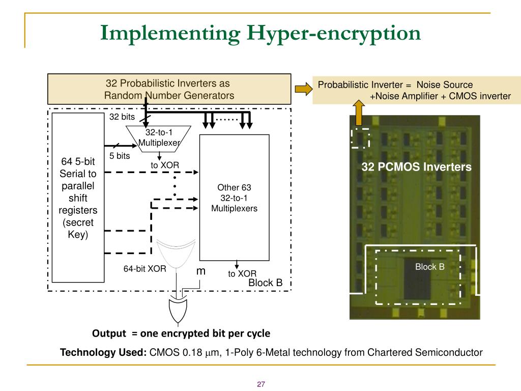 Implementing Hyper-encryption 32 Probabilistic Inverters as Random Number Generators Probabilistic Inverter = Noise Source +Noise Amplifier + CMOS inverter 32 bits 64 5-bit Serial to parallel shift registers (secret Key) 32-to-1 Multiplexer Other 63 32-to-1 Multiplexers 5 bits 32 PCMOS Inverters to XOR Block B 64-bit XOR m to XOR Block B Output = one encrypted bit per cycle Technology Used: CMOS 0.18 m, 1-Poly 6-Metal technology from Chartered Semiconductor