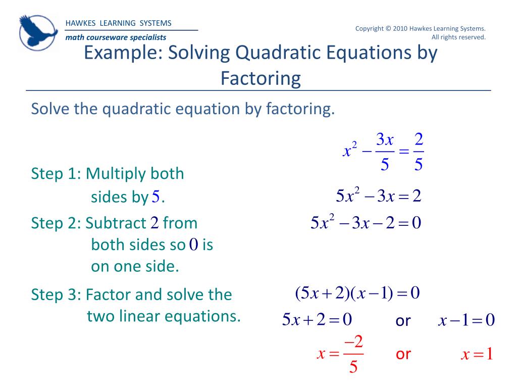 Example: Solving Quadratic Equations by Factoring Solve the quadratic equation by factoring. Step 1: Multiply both sides by . Step 2: Subtract from both sides so is on one side. Step 3: Factor and solve the two linear equations. or or