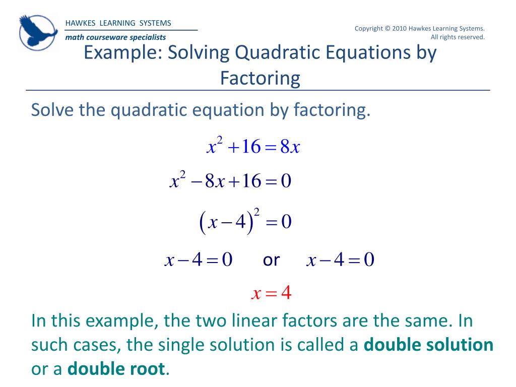 Example: Solving Quadratic Equations by Factoring Solve the quadratic equation by factoring. or In this example, the two linear factors are the same. In such cases, the single solution is called a double solution or a double root.