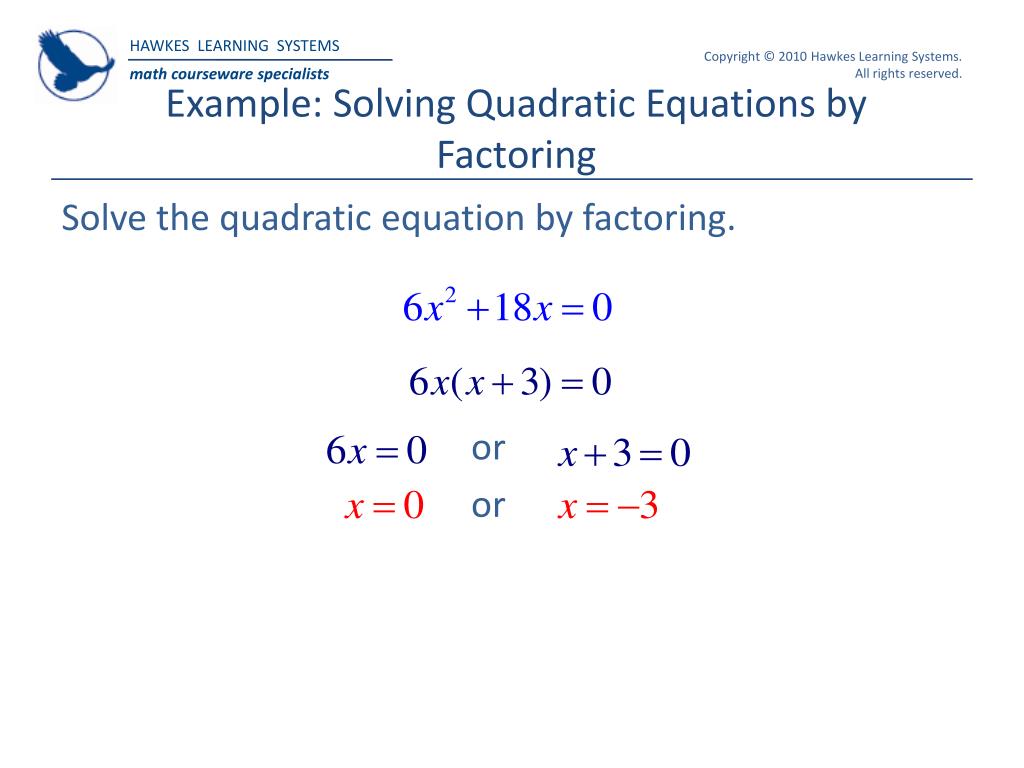 Example: Solving Quadratic Equations by Factoring Solve the quadratic equation by factoring. or or