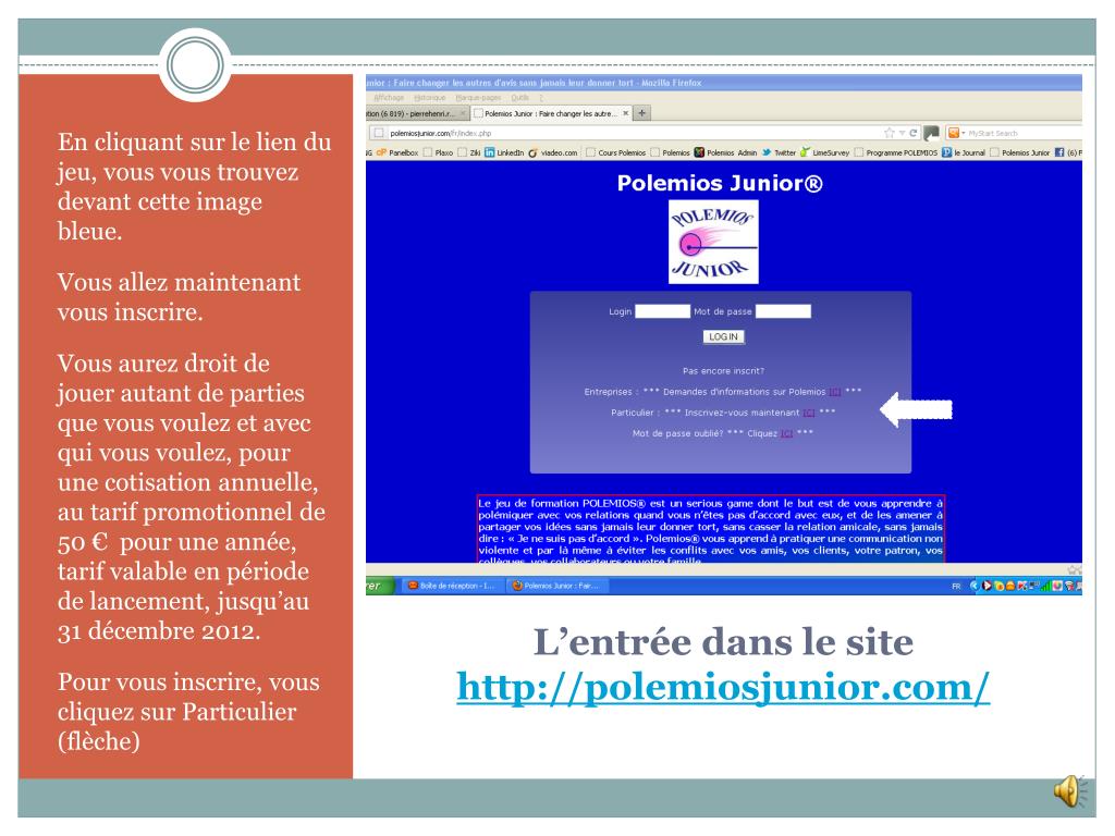 En cliquant sur le lien du jeu, vous vous trouvez devant cette image bleue. Vous allez maintenant vous inscrire. Vous aurez droit de jouer autant de parties que vous voulez et avec qui vous voulez, pour une cotisation annuelle, au tarif promotionnel de 50 € pour une année, tarif valable en période de lancement, jusqu’au 31 décembre 2012. Pour vous inscrire, vous cliquez sur Particulier (flèche) L’entrée dans le site http://polemiosjunior.com/