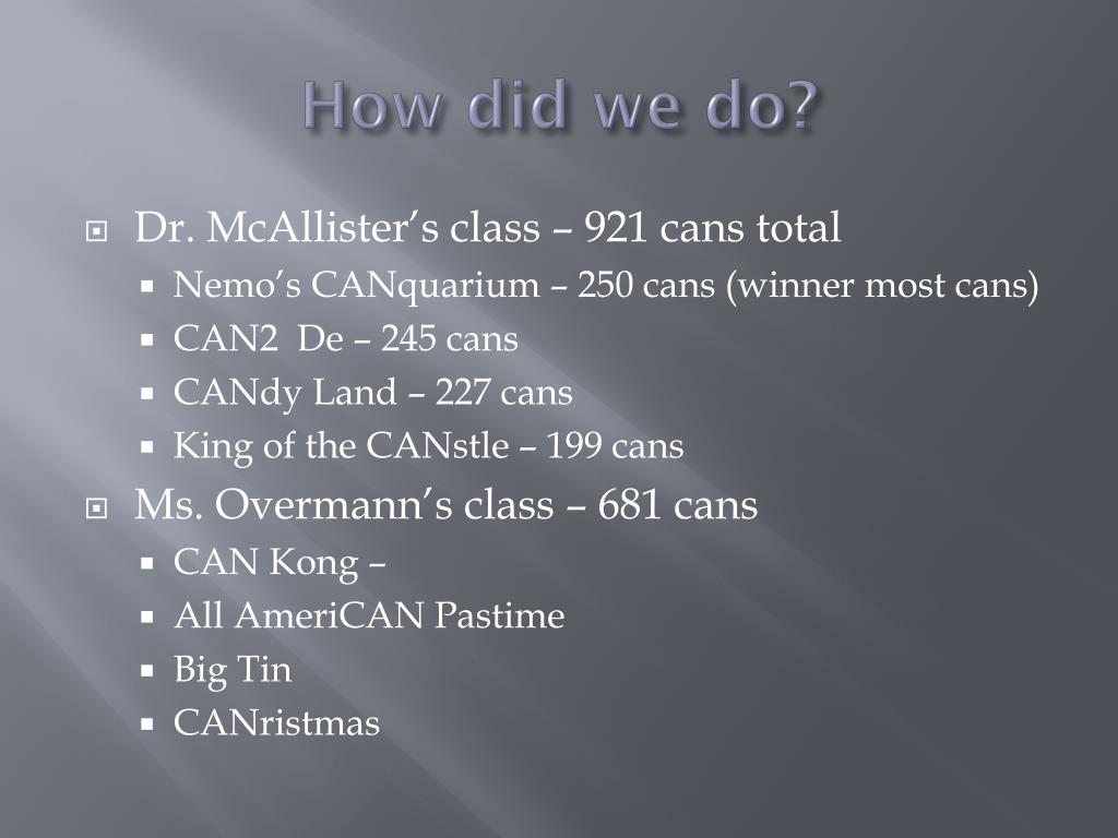 How did we do? • Dr. McAllister’s class – 921 cans total • Nemo’sCANquarium – 250 cans (winner most cans) • CAN2 De – 245 cans • CANdy Land – 227 cans • King of the CANstle – 199 cans • Ms. Overmann’s class – 681 cans • CAN Kong – • All AmeriCAN Pastime • Big Tin • CANristmas