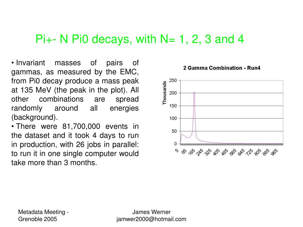 Pi+- N Pi0 decays, with N= 1, 2, 3 and 4 • Invariant masses of pairs of gammas, as measured by the EMC, from Pi0 decay produce a mass peak at 135 MeV (the peak in the plot). All other combinations are spread randomly around all energies (background). • There were 81,700,000 events in the dataset and it took 4 days to run in production, with 26 jobs in parallel: to run it in one single computer would take more than 3 months. James Werner jamwer2000@hotmail.com
