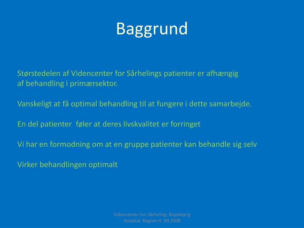 Baggrund Størstedelen af Videncenter for Sårhelings patienter er afhængig af behandling i primærsektor. Vanskeligt at få optimal behandling til at fungere i dette samarbejde. En del patienter føler at deres livskvalitet er forringet Vi har en formodning om at en gruppe patienter kan behandle sig selv Virker behandlingen optimalt Videncenter For Sårheling. Bispebjerg Hospital. Region H. SN 2008