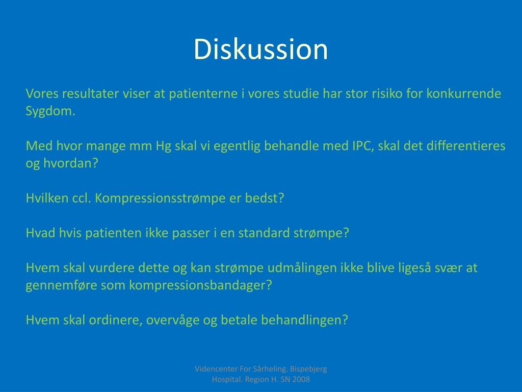 Diskussion Vores resultater viser at patienterne i vores studie har stor risiko for konkurrende Sygdom. Med hvor mange mm Hg skal vi egentlig behandle med IPC, skal det differentieres og hvordan? Hvilken ccl. Kompressionsstrømpe er bedst? Hvad hvis patienten ikke passer i en standard strømpe? Hvem skal vurdere dette og kan strømpe udmålingen ikke blive ligeså svær at gennemføre som kompressionsbandager? Hvem skal ordinere, overvåge og betale behandlingen? Videncenter For Sårheling. Bispebjerg Hospital. Region H. SN 2008