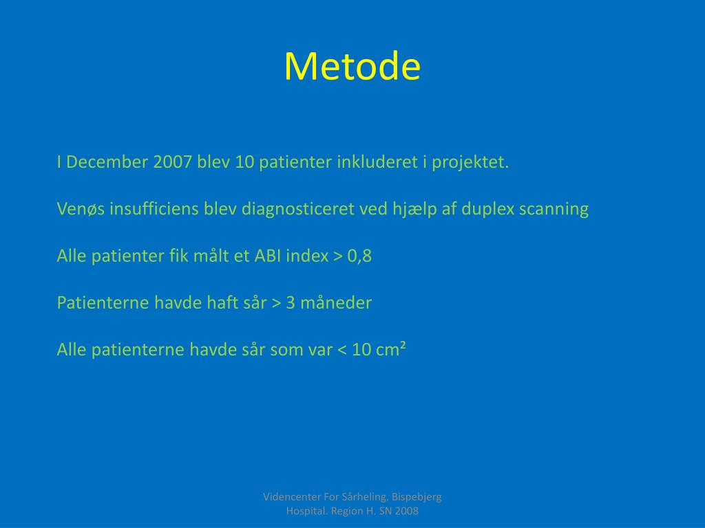 Metode I December 2007 blev 10 patienter inkluderet i projektet. Venøs insufficiens blev diagnosticeret ved hjælp af duplex scanning Alle patienter fik målt et ABI index > 0,8 Patienterne havde haft sår > 3 måneder Alle patienterne havde sår som var < 10 cm² Videncenter For Sårheling. Bispebjerg Hospital. Region H. SN 2008