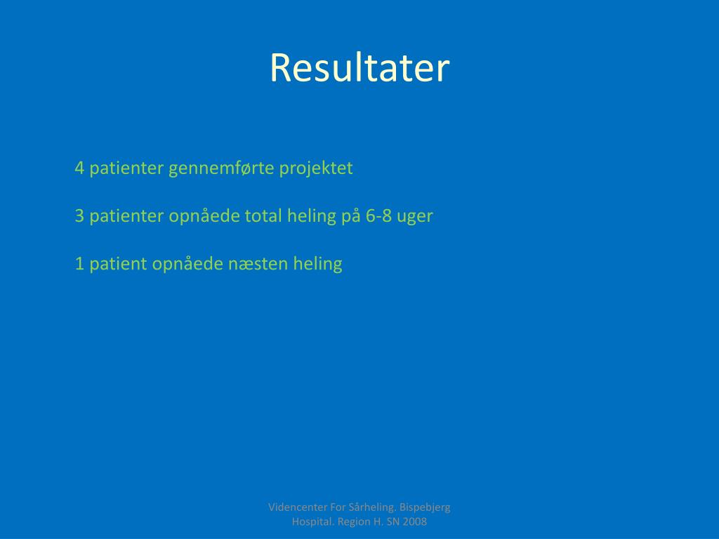 Resultater 4 patienter gennemførte projektet 3 patienter opnåede total heling på 6-8 uger 1 patient opnåede næsten heling Videncenter For Sårheling. Bispebjerg Hospital. Region H. SN 2008