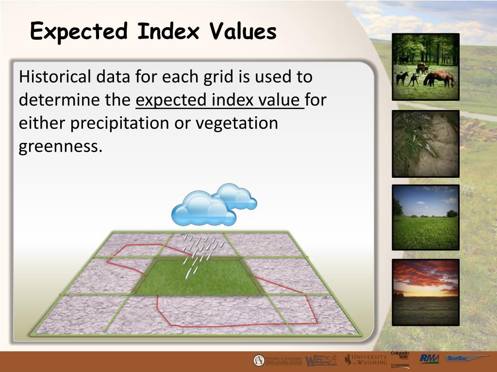 Expected Index Values Historical data for each grid is used to determine the expected index value for either precipitation or vegetation greenness.
