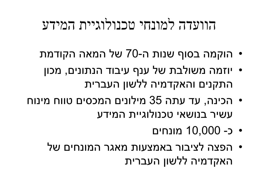 הוועדה למונחי טכנולוגיית המידע • הוקמה בסוף שנות ה-70 של המאה הקודמת • יוזמה משולבת של ענף עיבוד הנתונים, מכון התקנים והאקדמיה ללשון העברית • הכינה, עד עתה 35 מילונים המכסים טווח מינוח עשיר בנושאי טכנולוגיית המידע • כ- 10,000 מונחים • הפצה לציבור באמצעות מאגר המונחים של האקדמיה ללשון העברית