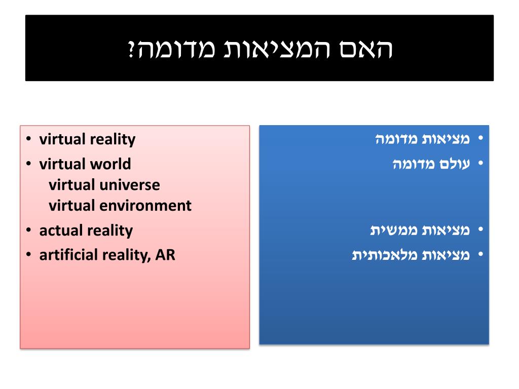 האם המציאות מדומה? מציאות מדומה עולם מדומה מציאות ממשית מציאות מלאכותית • virtual reality • virtual world virtual universe virtual environment • actual reality • artificial reality, AR