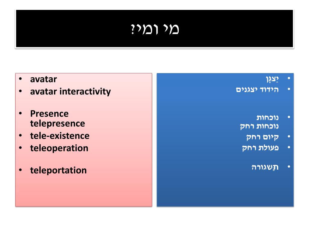 מי ומי? יַצגָּן הידוד יצגנים נוכחותנוכחות רחק קיום רחק פעולת רחק תַּשגורה • avatar • avatar interactivity • Presencetelepresence • tele-existence • teleoperation • teleportation