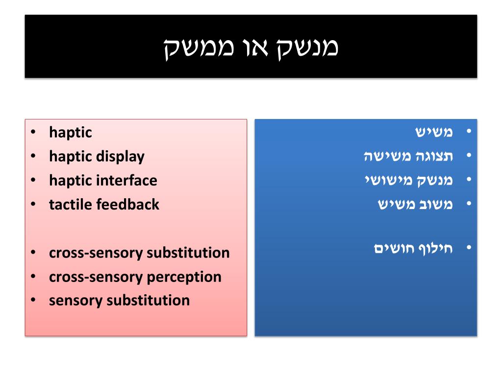 מנשק או ממשק משיש תצוגה משישה מנשק מישושי משוב משיש חילוף חושים • haptic • haptic display • haptic interface • tactile feedback • cross-sensory substitution • cross-sensory perception • sensory substitution