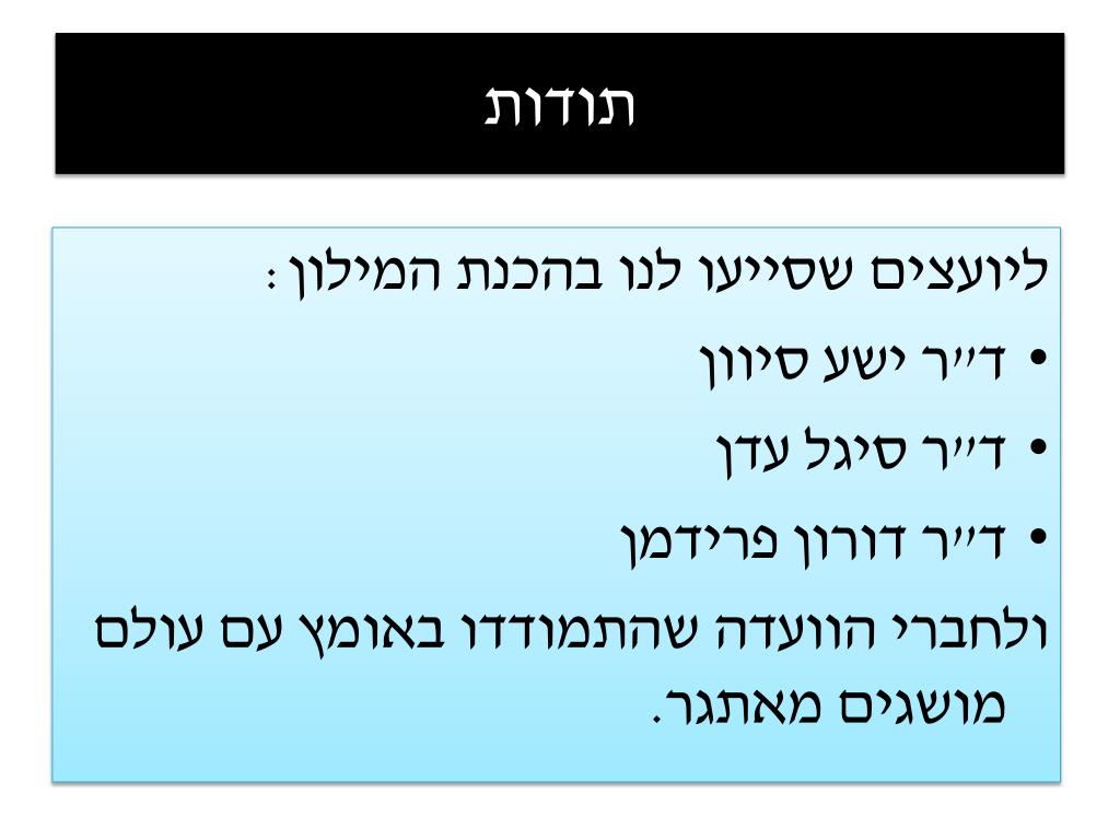 תודות ליועצים שסייעו לנו בהכנת המילון: • ד"ר ישע סיוון • ד"ר סיגל עדן • ד"ר דורון פרידמן ולחברי הוועדה שהתמודדו באומץ עם עולם מושגים מאתגר.