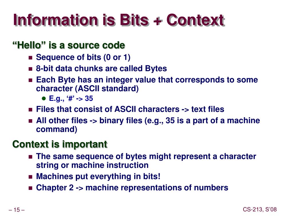 Information is Bits + Context • “Hello” is a source code • Sequence of bits (0 or 1) • 8-bit data chunks are called Bytes • Each Byte has an integer value that corresponds to some character (ASCII standard) • E.g., ‘#’ -> 35 • Files that consist of ASCII characters -> text files • All other files -> binary files (e.g., 35 is a part of a machine command) • Context is important • The same sequence of bytes might represent a character string or machine instruction • Machines put everything in bits! • Chapter 2 -> machine representations of numbers