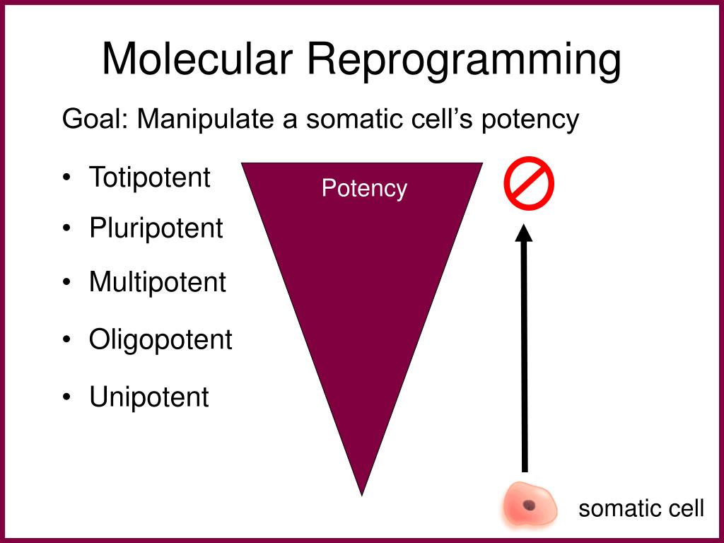 somatic cell Molecular Reprogramming Goal: Manipulate a somatic cell’s potency • Totipotent • Pluripotent • Multipotent • Oligopotent • Unipotent Potency