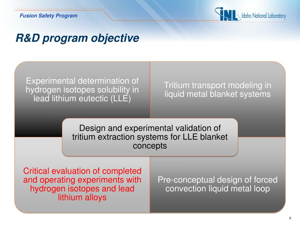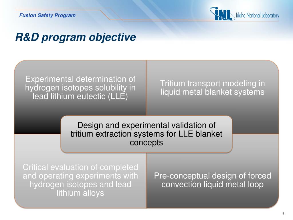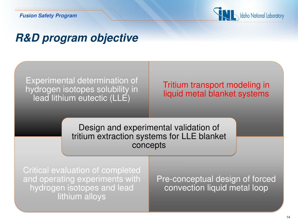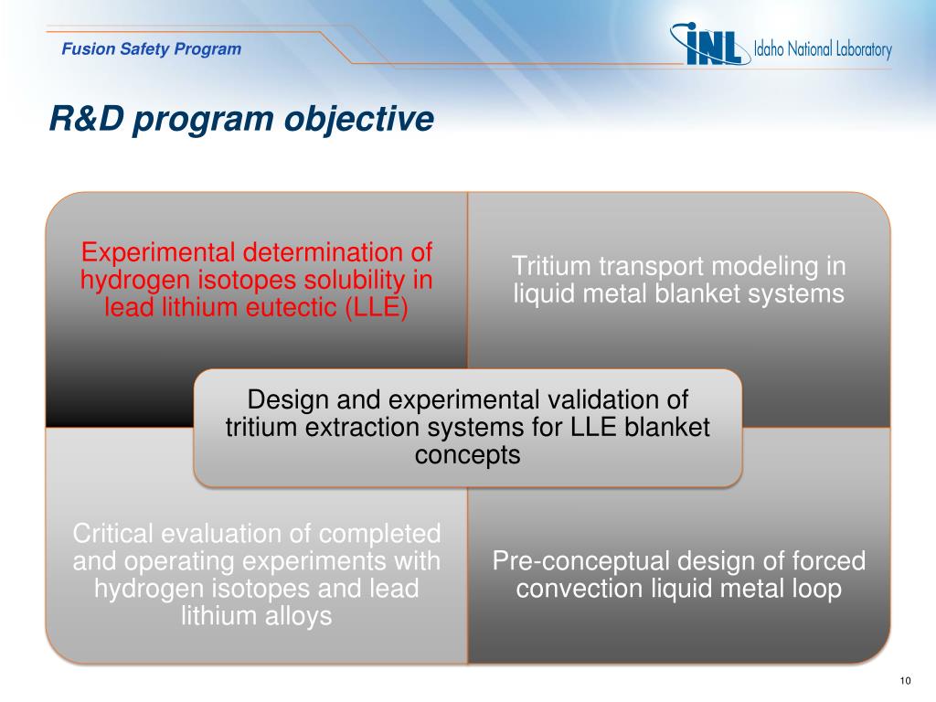 Tritium transport properties in lead-lithium eutectic. Pattrick Calderoni. www.inl.gov. Fusion Nuclear Science and Technology Annual Meeting August 2-4, 2010 UCLA. R&D program objective. Collaborative task. Near-term activities focus re-alignment. R&D program objective.
