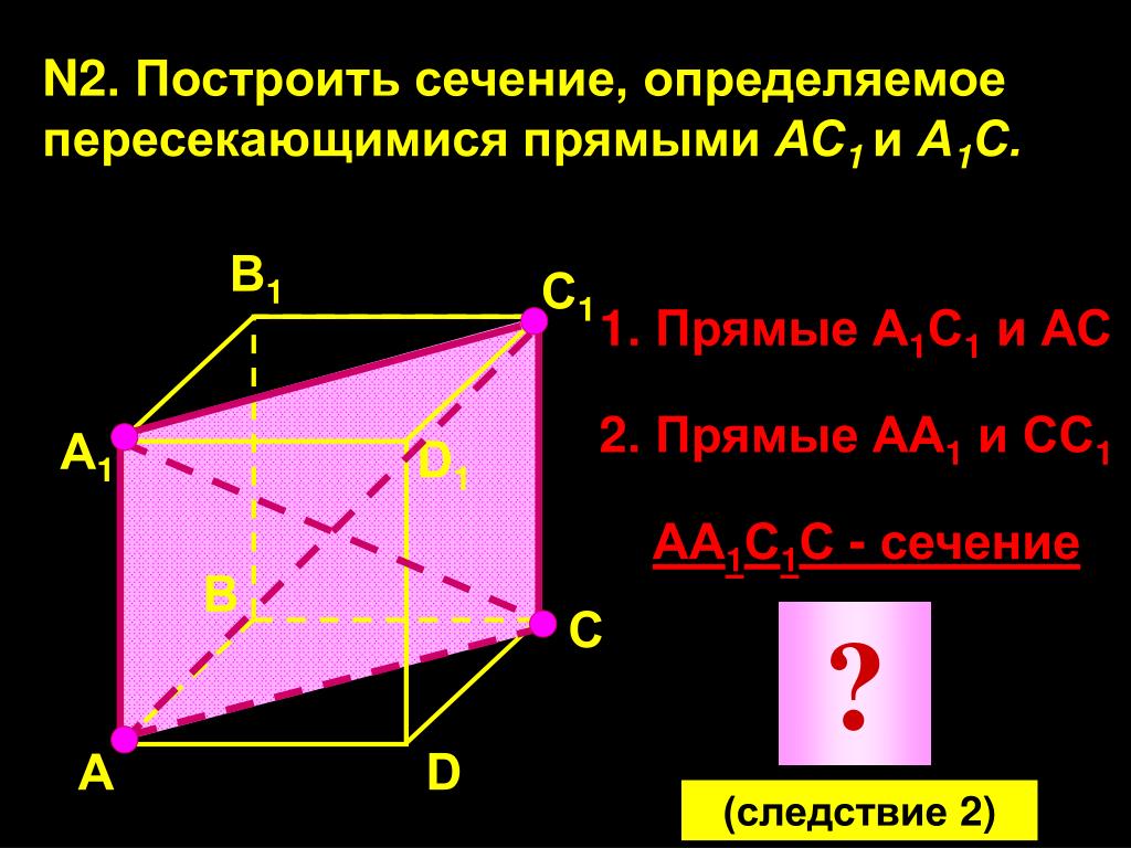 N2. Построить сечение, определяемое пересекающимися прямыми АС1и А1С. В1 С1 1. Прямые А1С1 и АС 2. Прямые АА1 и СС1 А1 D1 АА1С1С - сечение В С ? А D (следствие 2)