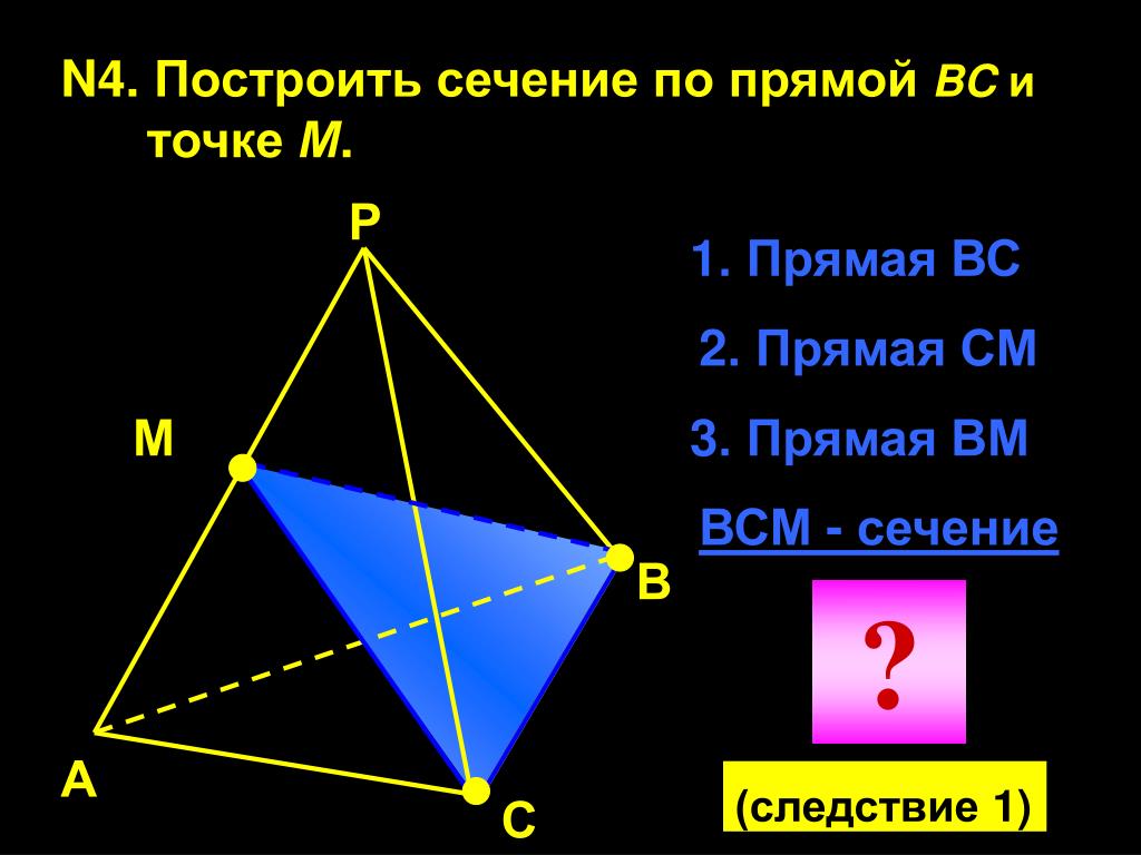 N4. Построить сечение по прямой BC и точке М. Р 1. Прямая ВС 2. Прямая СМ М 3. Прямая ВМ ВСМ - сечение В ? А (следствие 1) С