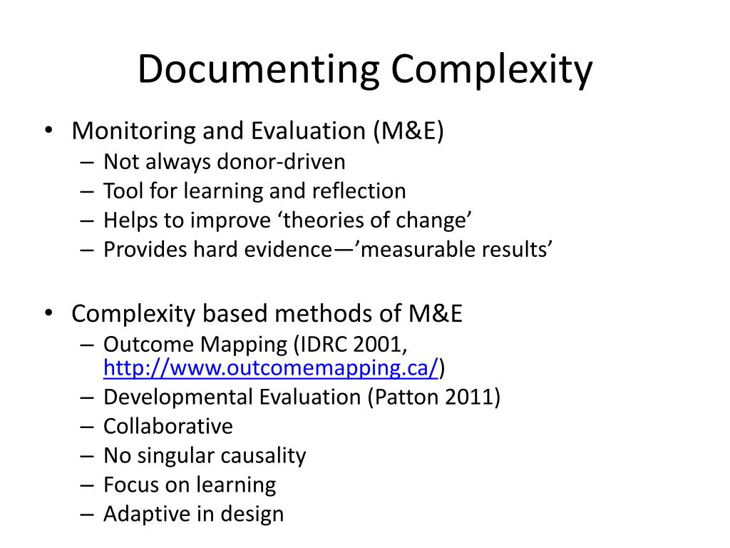 Documenting Complexity • Monitoring and Evaluation (M&E) • Not always donor-driven • Tool for learning and reflection • Helps to improve ‘theories of change’ • Provides hard evidence—’measurable results’ • Complexity based methods of M&E • Outcome Mapping (IDRC 2001, http://www.outcomemapping.ca/) • Developmental Evaluation (Patton 2011) • Collaborative • No singular causality • Focus on learning • Adaptive in design