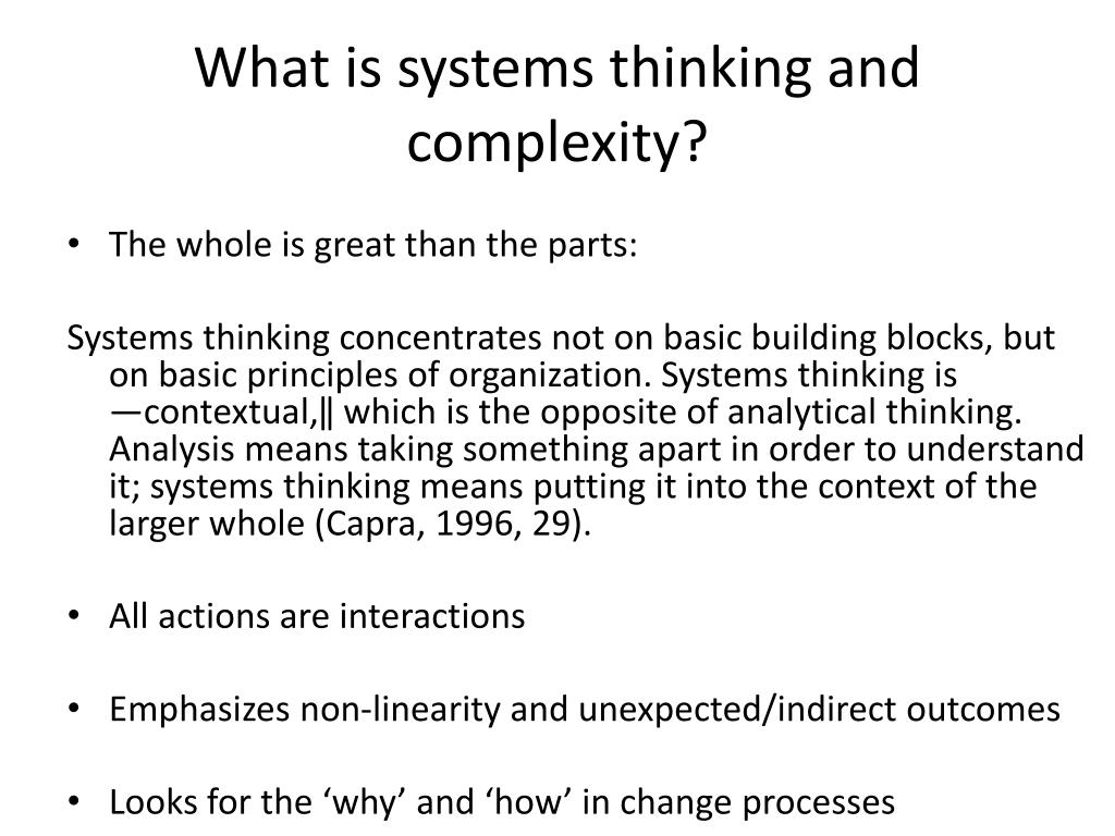 What is systems thinking and complexity? • The whole is great than the parts: Systems thinking concentrates not on basic building blocks, but on basic principles of organization. Systems thinking is ―contextual,‖ which is the opposite of analytical thinking. Analysis means taking something apart in order to understand it; systems thinking means putting it into the context of the larger whole (Capra, 1996, 29). • All actions are interactions • Emphasizes non-linearity and unexpected/indirect outcomes • Looks for the ‘why’ and ‘how’ in change processes