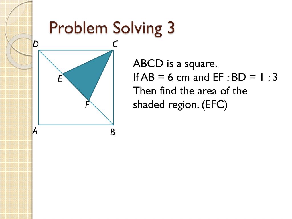Problem Solving 3 D C ABCD is a square. If AB = 6 cm and EF : BD = 1 : 3 Then find the area of the shaded region. (EFC) E F A B