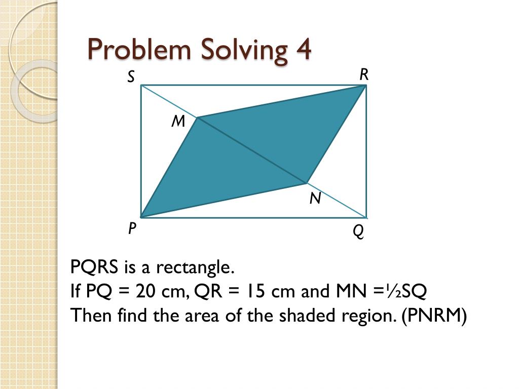 Problem Solving 4 R S M N P Q PQRS is a rectangle. If PQ = 20 cm, QR = 15 cm and MN =½SQ Then find the area of the shaded region. (PNRM)