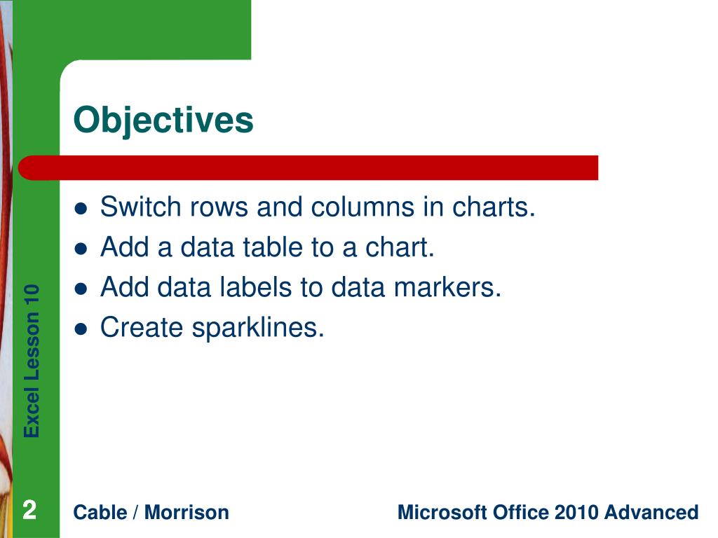 Excel Lesson 10 Using Advanced Chart Features. Microsoft Office 2010 Advanced. Cable / Morrison. Objectives. Switch rows and columns in charts. Add a data table to a chart. Add data labels to data markers. Create sparklines. 2. 2. Objectives (continued). Design combination charts.