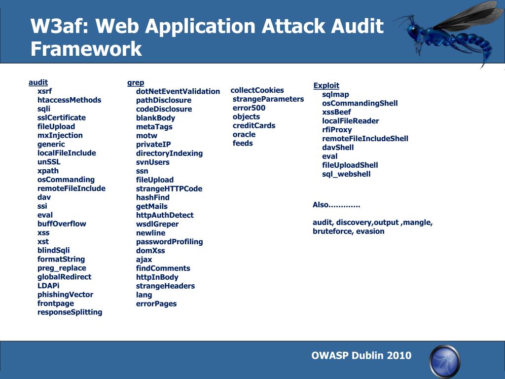 W3af: Web Application Attack Audit Framework auditxsrfhtaccessMethodssqlisslCertificatefileUploadmxInjection genericlocalFileIncludeunSSLxpathosCommandingremoteFileIncludedavssievalbuffOverflowxssxstblindSqliformatStringpreg_replaceglobalRedirectLDAPiphishingVectorfrontpageresponseSplitting grepdotNetEventValidationpathDisclosurecodeDisclosureblankBodymetaTagsmotwprivateIPdirectoryIndexingsvnUsersssnfileUploadstrangeHTTPCodehashFindgetMailshttpAuthDetectwsdlGreper newlinepasswordProfilingdomXssajaxfindCommentshttpInBodystrangeHeaderslangerrorPages ExploitsqlmaposCommandingShellxssBeeflocalFileReaderrfiProxyremoteFileIncludeShelldavShellevalfileUploadShellsql_webshell collectCookiesstrangeParameters error500 objectscreditCards oracle feeds Also…………. audit, discovery,output ,mangle, bruteforce, evasion