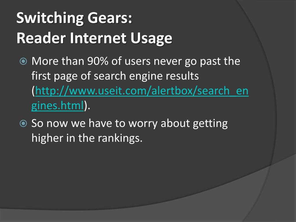 Switching Gears: Reader Internet Usage • More than 90% of users never go past the first page of search engine results (http://www.useit.com/alertbox/search_engines.html). • So now we have to worry about getting higher in the rankings.