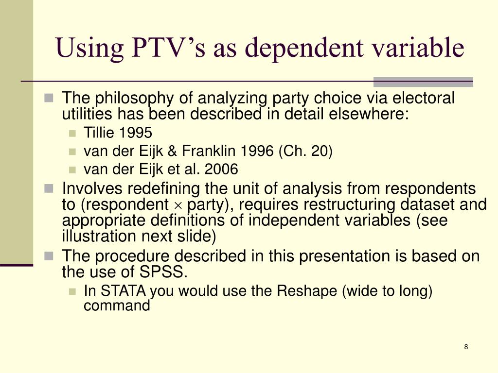 Using PTV’s as dependent variable • The philosophy of analyzing party choice via electoral utilities has been described in detail elsewhere: • Tillie 1995 • van der Eijk & Franklin 1996 (Ch. 20) • van der Eijk et al. 2006 • Involves redefining the unit of analysis from respondents to (respondent party), requires restructuring dataset and appropriate definitions of independent variables (see illustration next slide) • The procedure described in this presentation is based on the use of SPSS. • In STATA you would use the Reshape (wide to long) command