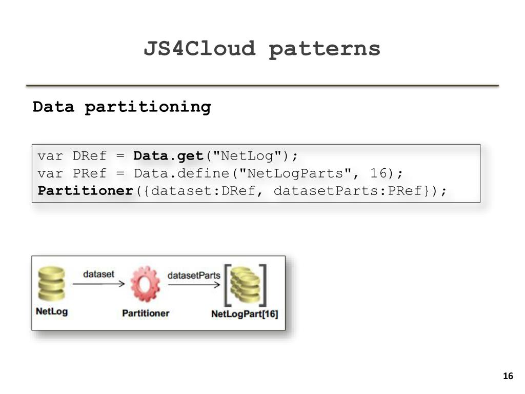 JS4Cloud patterns Data partitioning varDRef = Data.get("NetLog"); varPRef = Data.define("NetLogParts", 16); Partitioner({dataset:DRef, datasetParts:PRef});