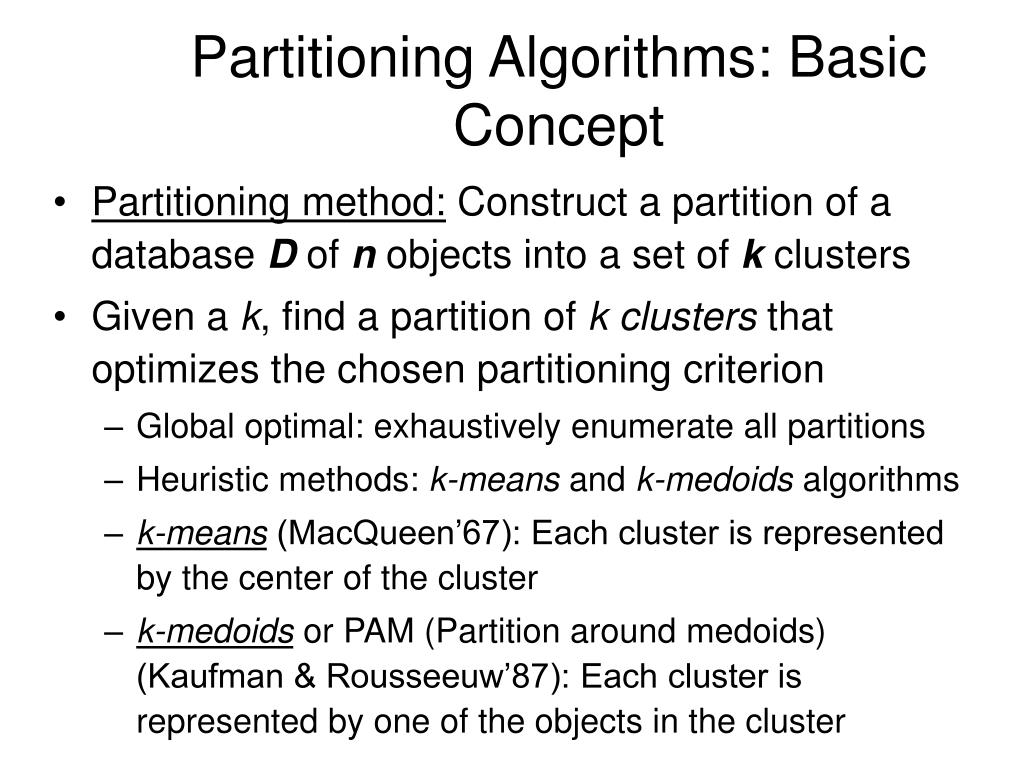 Partitioning Algorithms: Basic Concept • Partitioning method: Construct a partition of a database D of n objects into a set of k clusters • Given a k, find a partition of k clusters that optimizes the chosen partitioning criterion • Global optimal: exhaustively enumerate all partitions • Heuristic methods: k-means and k-medoids algorithms • k-means (MacQueen’67): Each cluster is represented by the center of the cluster • k-medoids or PAM (Partition around medoids) (Kaufman & Rousseeuw’87): Each cluster is represented by one of the objects in the cluster