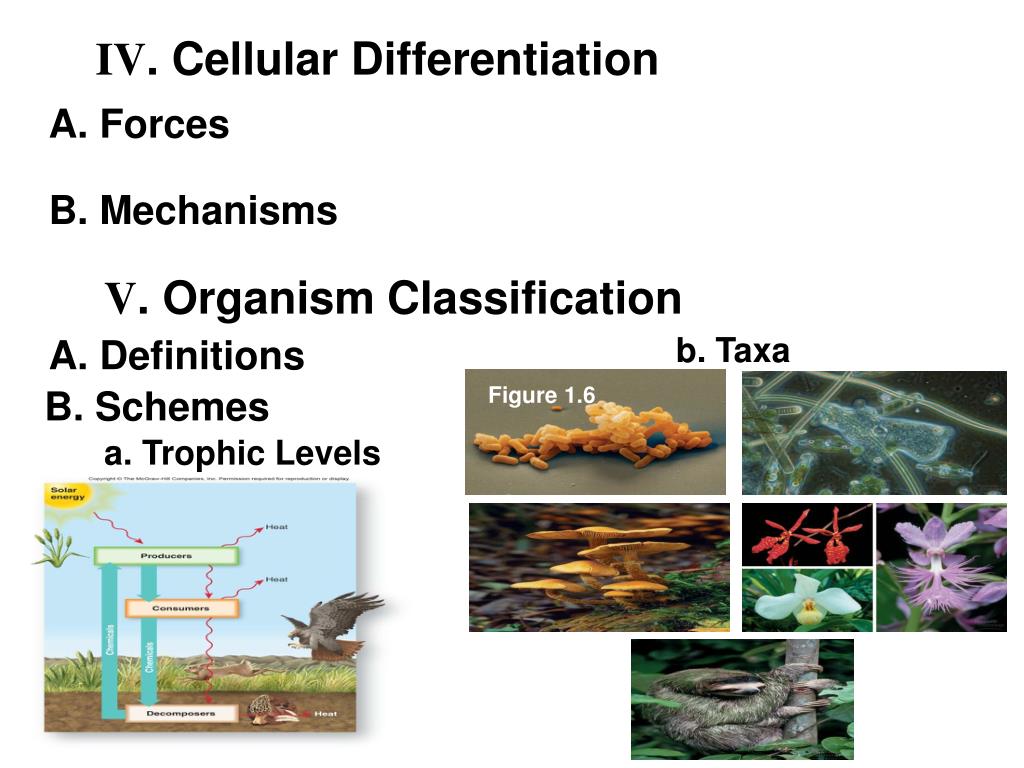 IV. Cellular Differentiation A. Forces B. Mechanisms V. Organism Classification b. Taxa A. Definitions Figure 1.6 B. Schemes a. Trophic Levels