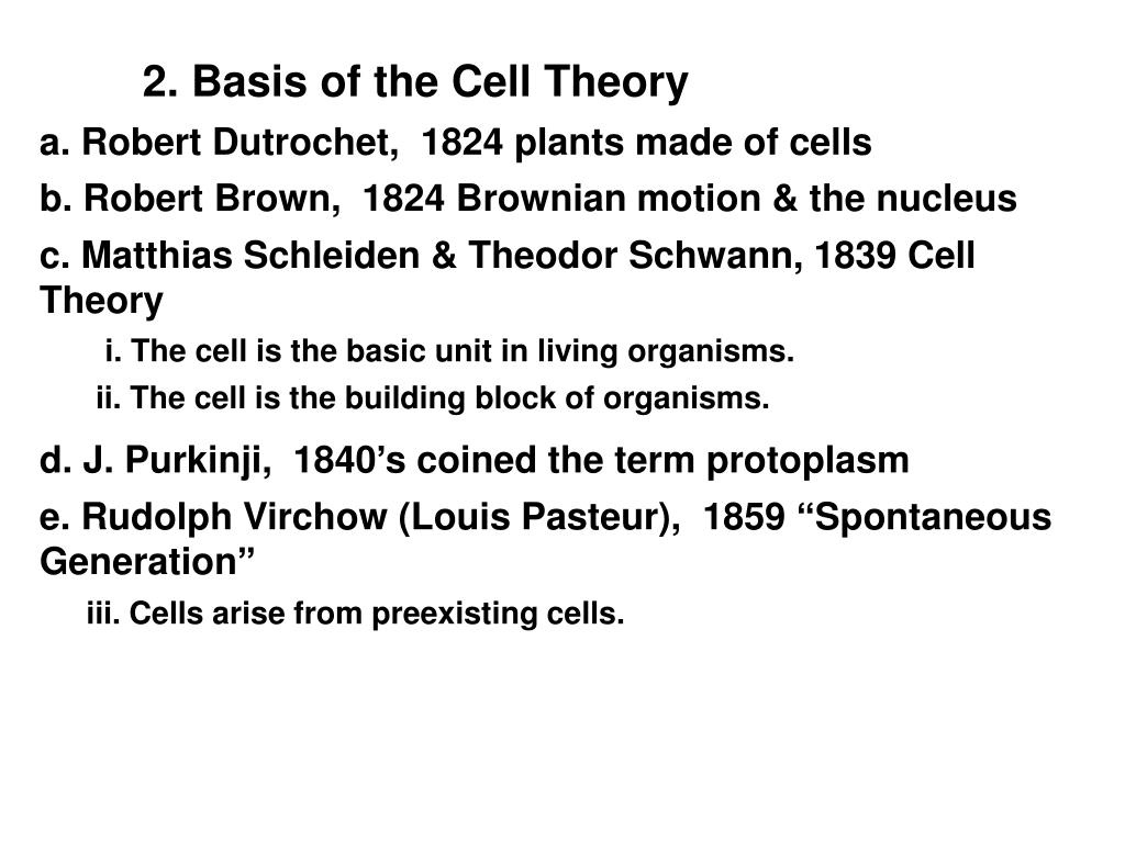 2. Basis of the Cell Theory a. Robert Dutrochet, 1824 plants made of cells b. Robert Brown, 1824 Brownian motion & the nucleus c. Matthias Schleiden & Theodor Schwann, 1839 Cell Theory i. The cell is the basic unit in living organisms. ii. The cell is the building block of organisms. d. J. Purkinji, 1840’s coined the term protoplasm e. Rudolph Virchow (Louis Pasteur), 1859 “Spontaneous Generation” iii. Cells arise from preexisting cells.