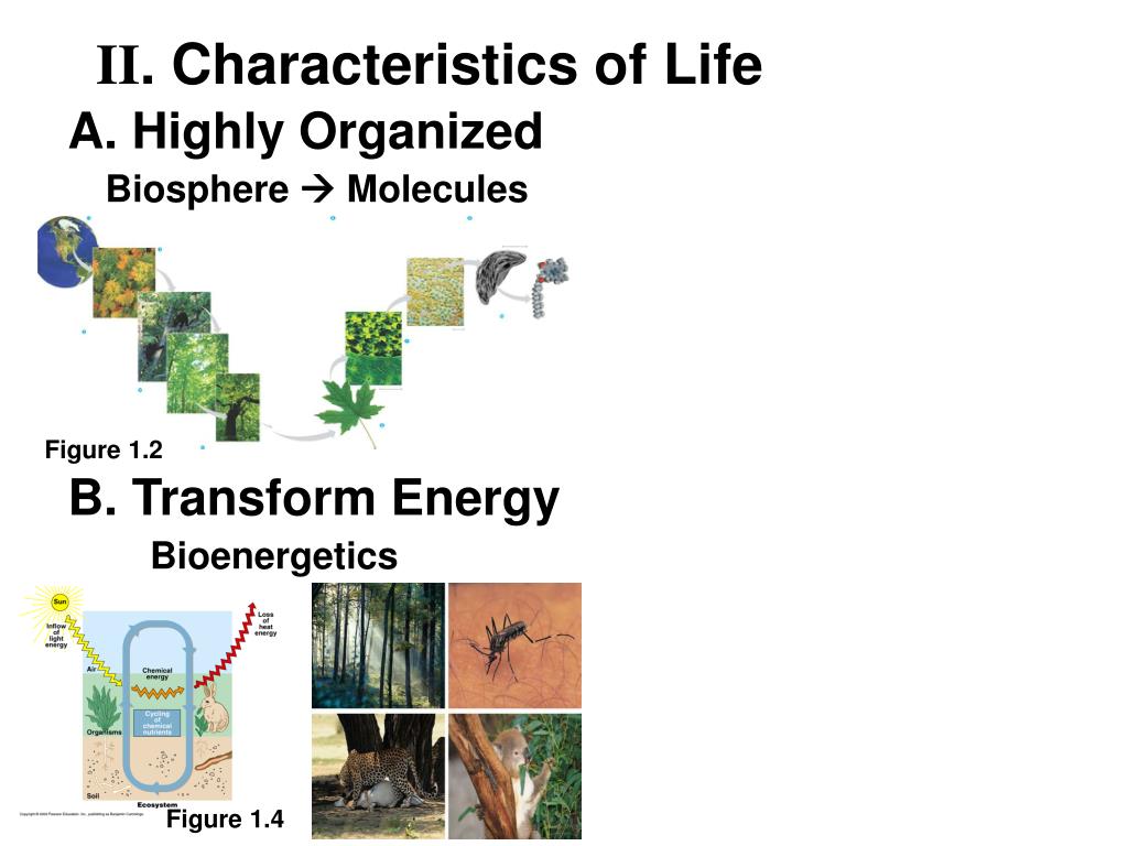 II. Characteristics of Life A. Highly Organized Biosphere Molecules Figure 1.2 B. Transform Energy Bioenergetics Figure 1.4