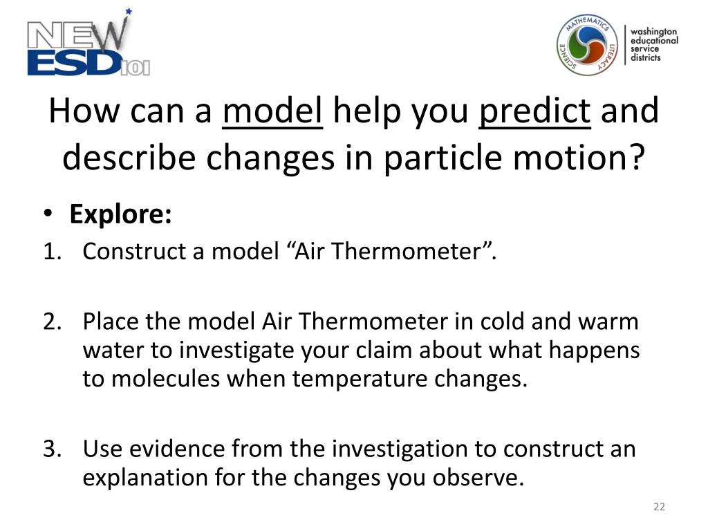 How can a model help you predict and describe changes in particle motion? • Explore: • Construct a model “Air Thermometer”. • Place the model Air Thermometer in cold and warm water to investigate your claim about what happens to molecules when temperature changes. • Use evidence from the investigation to construct an explanation for the changes you observe.