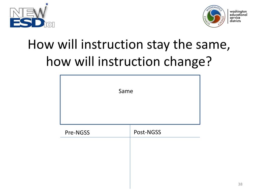 How will instruction stay the same, how will instruction change? Same Post-NGSS Pre-NGSS