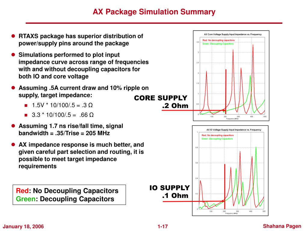 AX Package Simulation Summary • RTAXS package has superior distribution of power/supply pins around the package • Simulations performed to plot input impedance curve across range of frequencies with and without decoupling capacitors for both IO and core voltage • Assuming .5A current draw and 10% ripple on supply, target impedance: • 1.5V * 10/100/.5 = .3 Ω • 3.3 * 10/100/.5 = .66 Ω • Assuming 1.7 ns rise/fall time, signal bandwidth = .35/Trise = 205 MHz • AX impedance response is much better, and given careful part selection and routing, it is possible to meet target impedance requirements CORE SUPPLY .2 Ohm IO SUPPLY Red: No Decoupling Capacitors Green: Decoupling Capacitors .1 Ohm