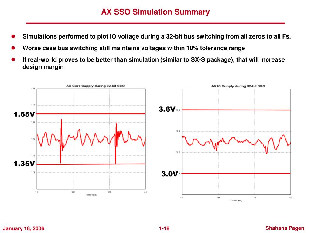 AX SSO Simulation Summary • Simulations performed to plot IO voltage during a 32-bit bus switching from all zeros to all Fs. • Worse case bus switching still maintains voltages within 10% tolerance range • If real-world proves to be better than simulation (similar to SX-S package), that will increase design margin 3.6V 1.65V 1.35V 3.0V