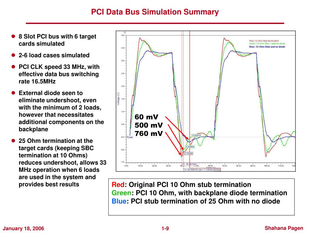 PCI Data Bus Simulation Summary • 8 Slot PCI bus with 6 target cards simulated • 2-6 load cases simulated • PCI CLK speed 33 MHz, with effective data bus switching rate 16.5MHz • External diode seen to eliminate undershoot, even with the minimum of 2 loads, however that necessitates additional components on the backplane • 25 Ohm termination at the target cards (keeping SBC termination at 10 Ohms) reduces undershoot, allows 33 MHz operation when 6 loads are used in the system and provides best results 60 mV 500 mV 760 mV Red: Original PCI 10 Ohm stub termination Green: PCI 10 Ohm, with backplane diode termination Blue: PCI stub termination of 25 Ohm with no diode
