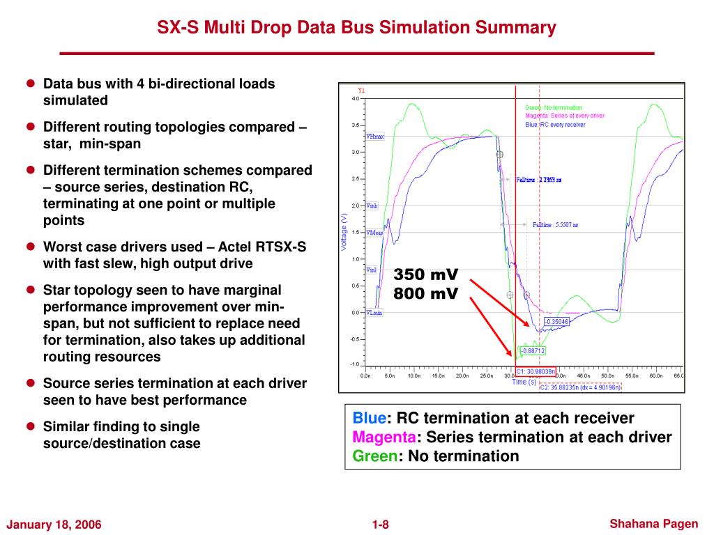 SX-S Multi Drop Data Bus Simulation Summary • Data bus with 4 bi-directional loads simulated • Different routing topologies compared – star, min-span • Different termination schemes compared – source series, destination RC, terminating at one point or multiple points • Worst case drivers used – Actel RTSX-S with fast slew, high output drive • Star topology seen to have marginal performance improvement over min-span, but not sufficient to replace need for termination, also takes up additional routing resources • Source series termination at each driver seen to have best performance • Similar finding to single source/destination case 350 mV 800 mV Blue: RC termination at each receiver Magenta: Series termination at each driver Green: No termination