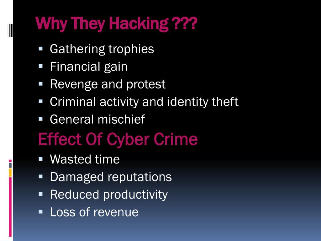 Why They Hacking ??? • Gathering trophies • Financial gain • Revenge and protest • Criminal activity and identity theft • General mischief Effect Of Cyber Crime • Wasted time • Damaged reputations • Reduced productivity • Loss of revenue