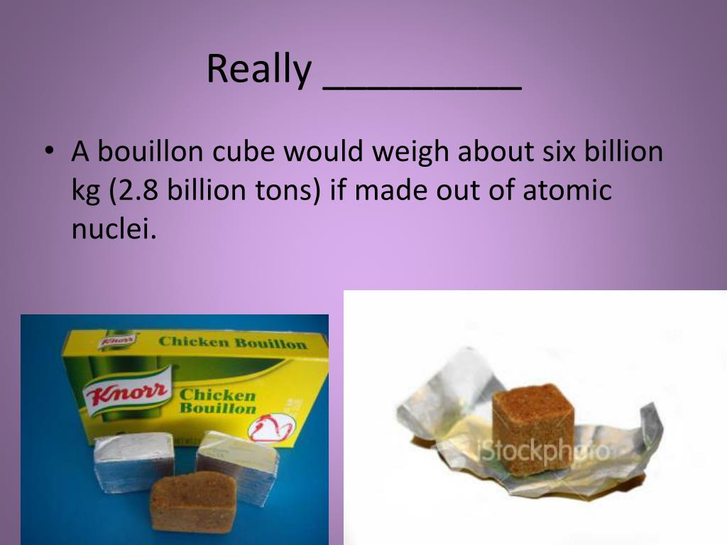 Really _________ • A bouillon cube would weigh about six billion kg (2.8 billion tons) if made out of atomic nuclei.