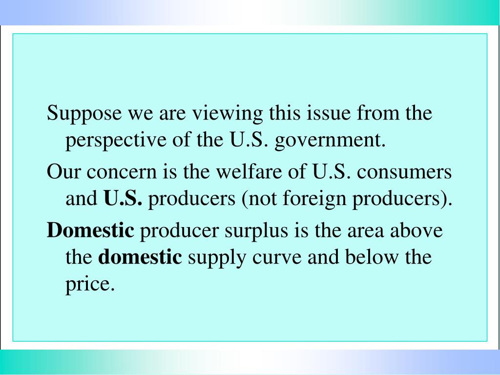 Suppose we are viewing this issue from the perspective of the U.S. government. Our concern is the welfare of U.S. consumers and U.S. producers (not foreign producers). Domestic producer surplus is the area above the domestic supply curve and below the price.