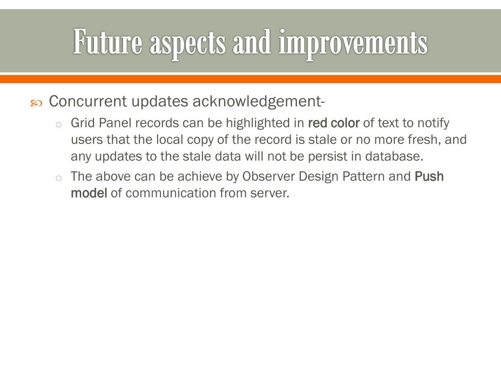 Future aspects and improvements • Concurrent updates acknowledgement- • Grid Panel records can be highlighted in red color of text to notify users that the local copy of the record is stale or no more fresh, and any updates to the stale data will not be persist in database. • The above can be achieve by Observer Design Pattern and Push model of communication from server.