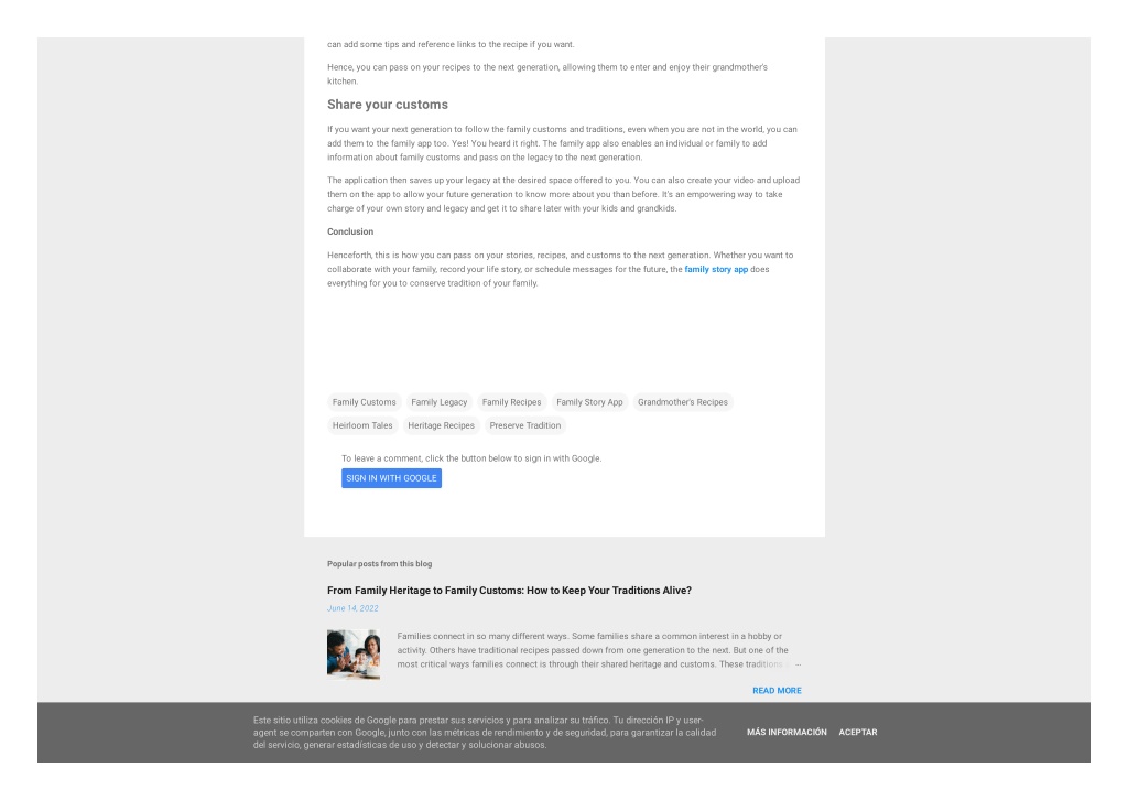 can add some tips and reference links to the recipe if you want. Hence, you can pass on your recipes to the next generation, allowing them to enter and enjoy their grandmother's kitchen. Share your customs If you want your next generation to follow the family customs and traditions, even when you are not in the world, you can add them to the family app too. Yes! You heard it right. The family app also enables an individual or family to add information about family customs and pass on the legacy to the next generation. The application then saves up your legacy at the desired space offered to you. You can also create your video and upload them on the app to allow your future generation to know more about you than before. It's an empowering way to take charge of your own story and legacy and get it to share later with your kids and grandkids. Conclusion Henceforth, this is how you can pass on your stories, recipes, and customs to the next generation. Whether you want to collaborate with your family, record your life story, or schedule messages for the future, the family story app does everything for you to conserve tradition of your family. Family Customs Family Legacy Family Recipes Family Story App Grandmother's Recipes Heirloom Tales Heritage Recipes Preserve Tradition To leave a comment, click the button below to sign in with Google. SIGN IN WITH GOOGLE Popular posts from this blog From Family Heritage to Family Customs: How to Keep Your Traditions Alive? June 14, 2022 Families connect in so many different ways. Some families share a common interest in a hobby or activity. Others have traditional recipes passed down from one generation to the next. But one of the most critical ways families connect is through their shared heritage and customs. These traditions are… READ MORE Este sitio utiliza cookies de Google para prestar sus servicios y para analizar su trá?co. Tu dirección IP y user- agent se comparten con Google, junto con las métricas de rendimiento y de seguridad, para garantizar la calidad del servicio, generar estadísticas de uso y detectar y solucionar abusos. MÁS INFORMACIÓN ACEPTAR Powered by Blogger