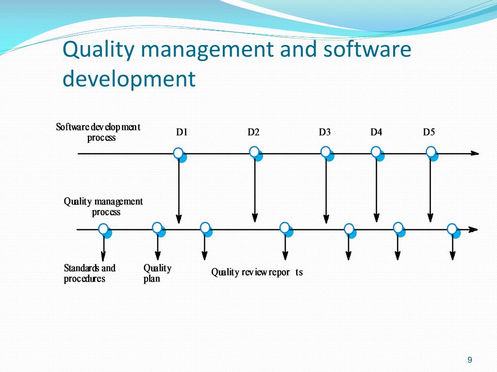 Process quality management Process quality management involves: • Defining process standards such as how and when reviews should be conducted. • Monitoring the development process to ensure that standards are being followed. • Reporting the software process to project management and to the buyer of the software. One problem with process-based quality assurance is that the quality assurance team may insist that standard processes should be used irrespective of the type of software that is being developed.