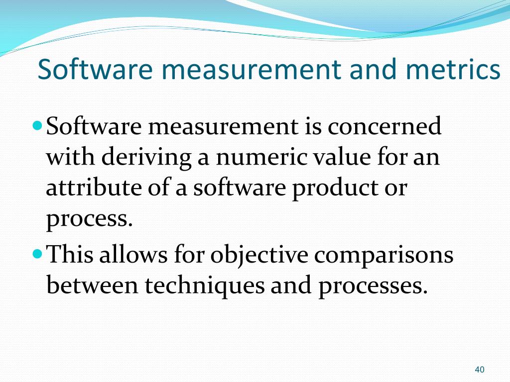 Software measurement and metrics • Software measurement is concerned with deriving a numeric value for an attribute of a software product or process. • This allows for objective comparisons between techniques and processes.
